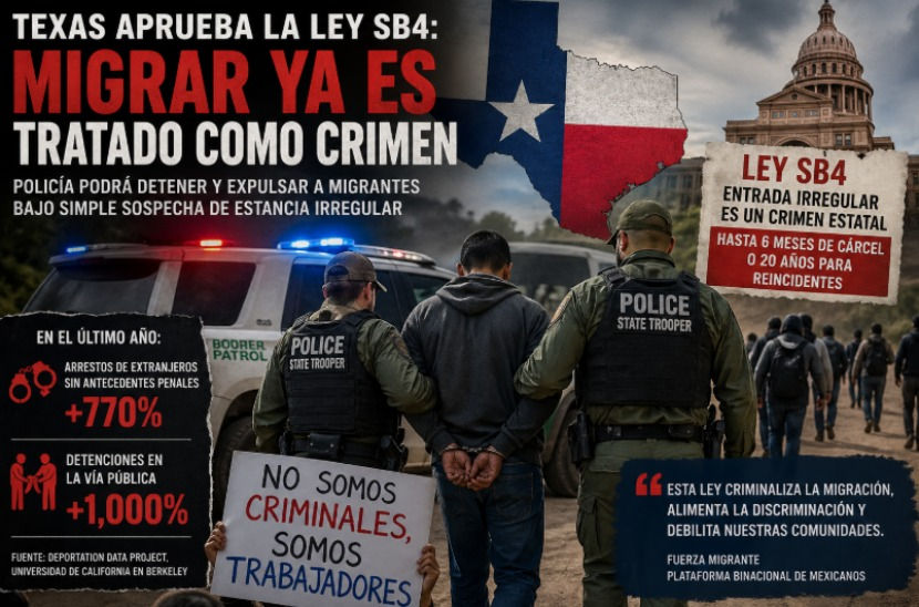 Ciudad de México 26 de abril 2026.- Texas ha dado un paso que redefine, de forma drástica, su política migratoria: con el aval judicial a la ley SB4, la policía estatal ya puede detener y expulsar a personas migrantes bajo simple sospecha de estancia irregular. La medida, que entró en vigor de inmediato tras el fallo de un tribunal de apelaciones, se aplica en un contexto donde los arrestos de extranjeros sin antecedentes penales han aumentado un 770 % y las detenciones en la vía pública más de un 1.000 %, según datos del Deportation Data Project.